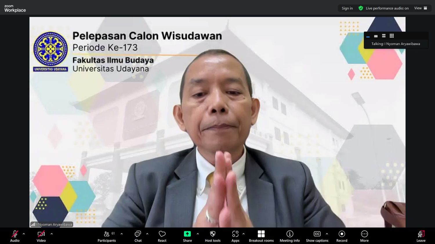 The Faculty of Humanities Udayana University, held a graduation ceremony for the 173rd period graduates on Thursday, December 18, 2025, online via the Zoom Meeting application. The ceremony was attended by the Dean, Deputy Deans, Program Coordinators from the undergraduate, master's, and Doctoral programs, heads of units including Coordinators from the Unit of Research and Community Service, Unit of Quality Assurance, Unit of Information and Cooperation , Indonesian Language Center (BIPA), Indonesian Language and Culture Center (BIPAS), and Faculty of Business Center, as well as graduating students from the undergraduate studies, Magister and Doctoral programs.